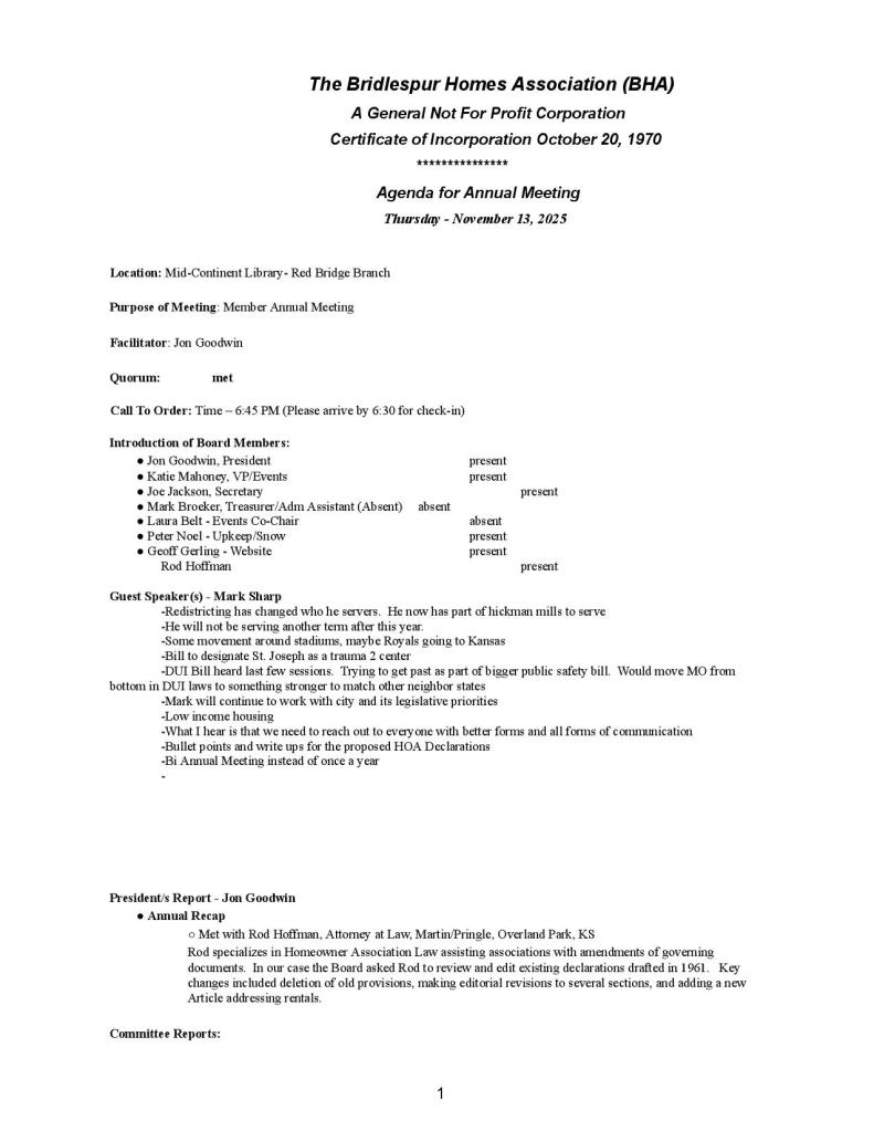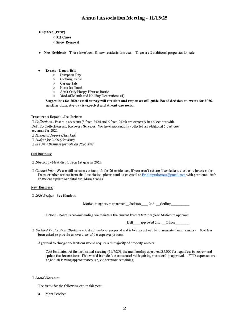 - Updated Declarations/By-Laws – With the changing conditions with ownership in the housing market as it relates to out of state buyers, investors and/or non-resident buyers, the Board is recommending that an update to our Declarations and By-Laws. Primary focus would be to restrict non-resident ownership, thus restricting rentals and AirBNB’s. The goal would be to maintain Bridlespur as a single family residence with owner occupancy. By-Laws would be reviewed and updated accordingly.