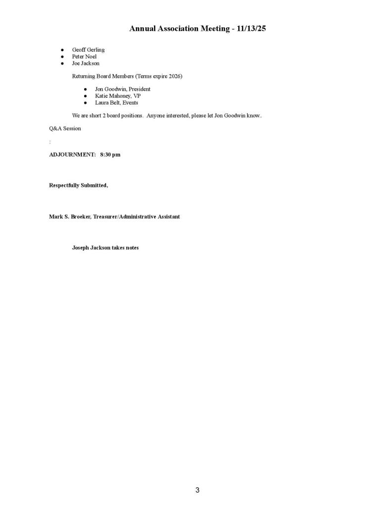 - Mark Broeker has accepted the Adm Assistant position (Wanda’s replacement) He also serves the Association Treasurer