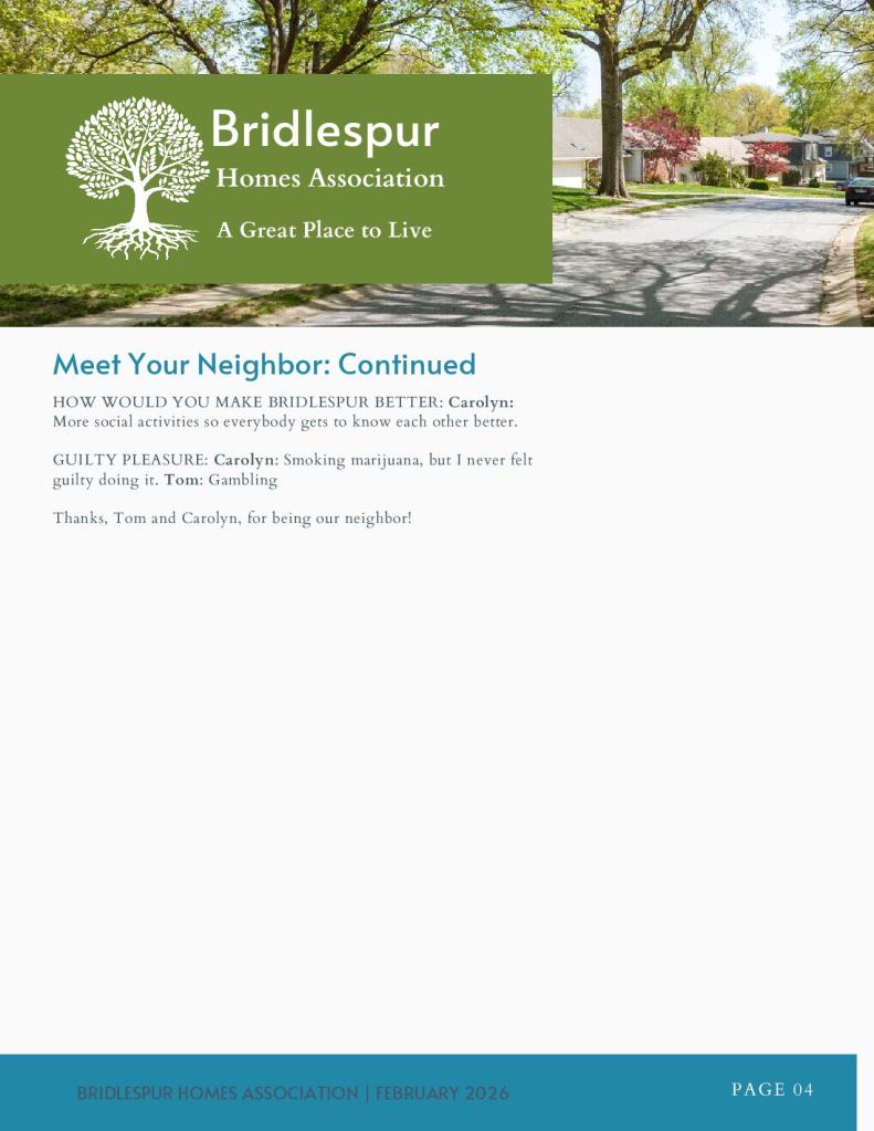 Newsletter Library Home / Site NavigationAboutCity and Other ResourcesAgendas & MinutesBridlespur Bylaws & MapNewsletter LibraryMeet the BoardContactServicesIssue Reporting Process February 2026 September 2025 September 2024 Bridlespur-Homes-Association-Sept-2024-NewsletterDownload July 2024 July-2024-Bridlespur-Homes-Association-NewsletterDownload May 2024 May-Bridlespur-Homes-Association-NewsletterDownload April 2024 April-Bridlespur-Homes-Association-NewsletterDownload March 2024 March-Bridlespur-Homes-Association-NewsletterDownload February 2024 February-2024-Bridlespur-Homes-Association-NewsletterDownload January 2024 January-2024-NewsletterDownload December 2023 December-Bridlespur-Homes-Association-NewsletterDownload November 2023 Bridlespur-November-NewsletterDownload October 2023 Bridlespur-October-Homes-Association-NewsletterDownload July 2023 Bridlespur-Homes-Association-Newsletter-2Download newsletter-february-2023Download newsletter-january-2023Download